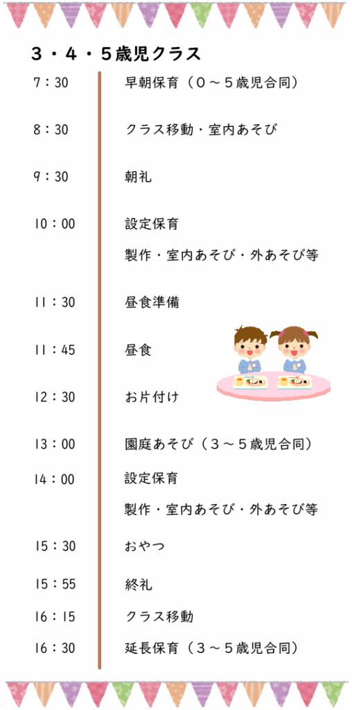 ⇒ 献立の見本はこちら ※朝のおやつは0~2歳児クラスのみです。3~5歳児クラスでは、栄養士による食事のマナーやトウモロコシ皮むき、ピザパン作りなど各学年に合わせ食育を行い、食に対する興味を育みます。